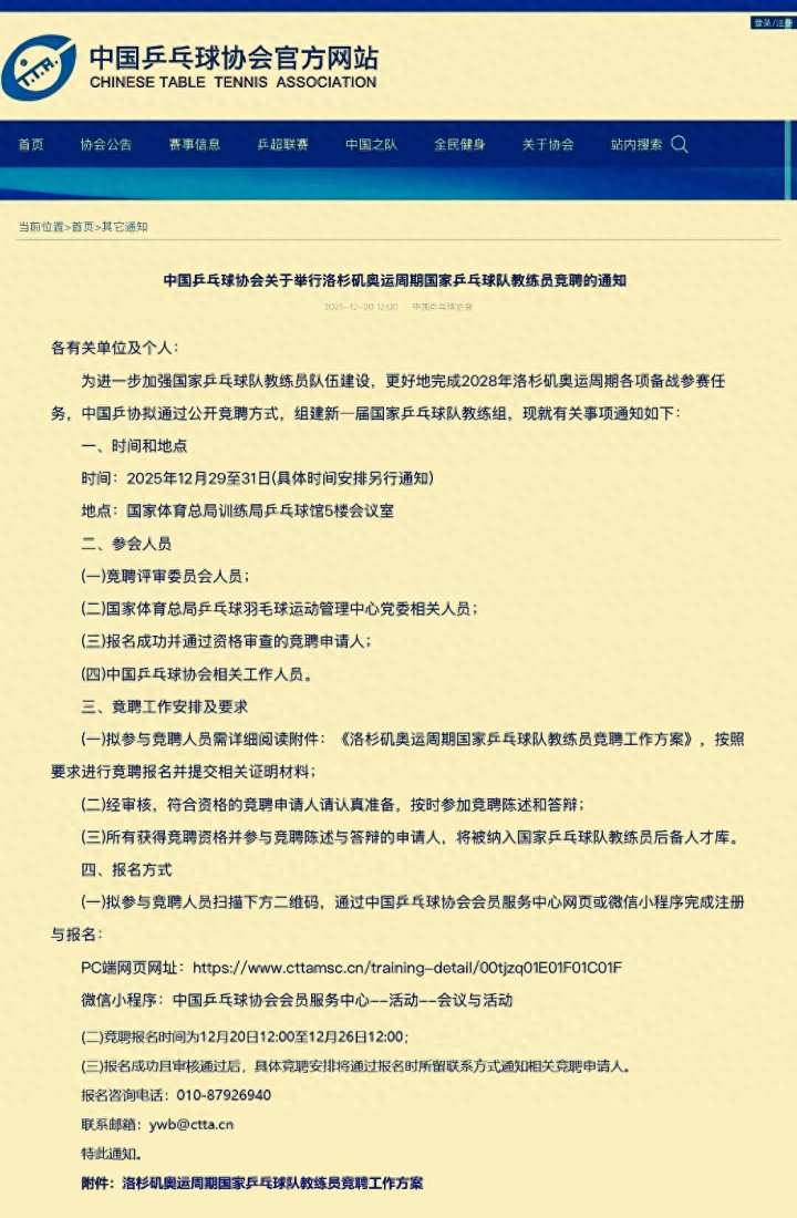 北京时间12月20日西安高新配资,中国乒协在官网上发布《中国乒乓球协会关于举行洛杉矶奥运周期国家乒乓球队教练员竞聘的通知》,正式启动洛奥周期国乒教练员公开竞聘工作。